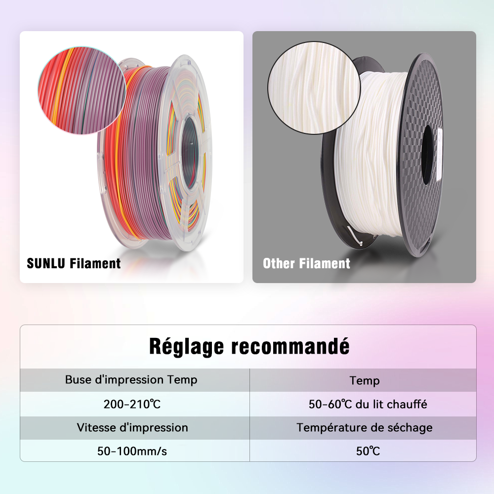 Filament SUNLU 100 % enroulé soigneusement. Grâce à sa technologie propriétaire, SUNLU maîtrise des procédés avancés et produit un filament PLA PLUS/PLA+ 100 % parfaitement enroulé — un niveau que les autres marques ne peuvent atteindre. Sans nœuds, sans déroulement désordonné : votre efficacité d’impression est optimisée.
