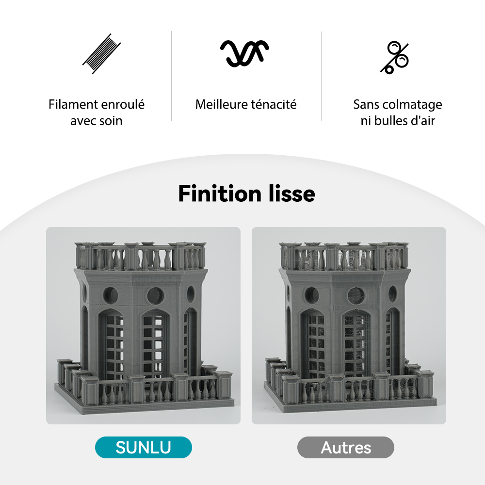 Filament SUNLU 100 % enroulé soigneusement. Grâce à sa technologie propriétaire, SUNLU maîtrise des procédés avancés et produit un filament PLA PLUS/PLA+ 100 % parfaitement enroulé — un niveau que les autres marques ne peuvent atteindre. Sans nœuds, sans déroulement désordonné : votre efficacité d’impression est optimisée.