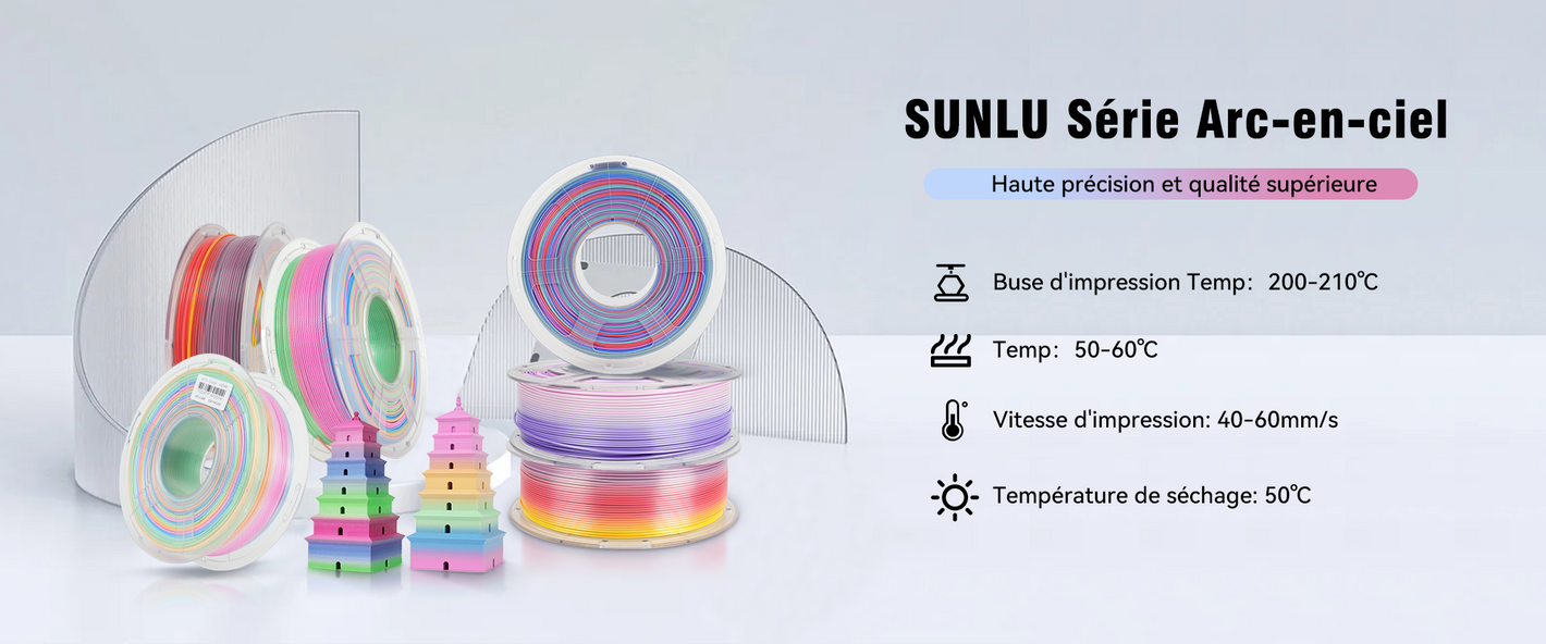 【Rainbow PLA/SILK PLA+ Filament】– Le SUNLU Rainbow PLA est fiable, polyvalent et adapté aux débutants. Il imprime en douceur, sans bouchons, bulles ni enchevêtrements, et son excellente adhérence inter-couches garantit des résultats constants et de haute qualité.
