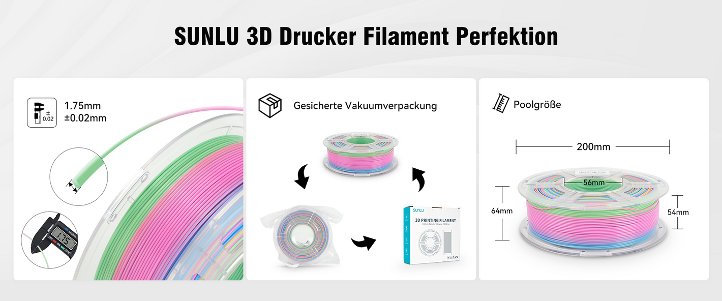 【Vacuum Packaging】– Les filaments arc-en-ciel SUNLU sont emballés sous vide avec un déshydratant afin d’éviter l’humidité et la poussière, garantissant une performance de filament optimale.