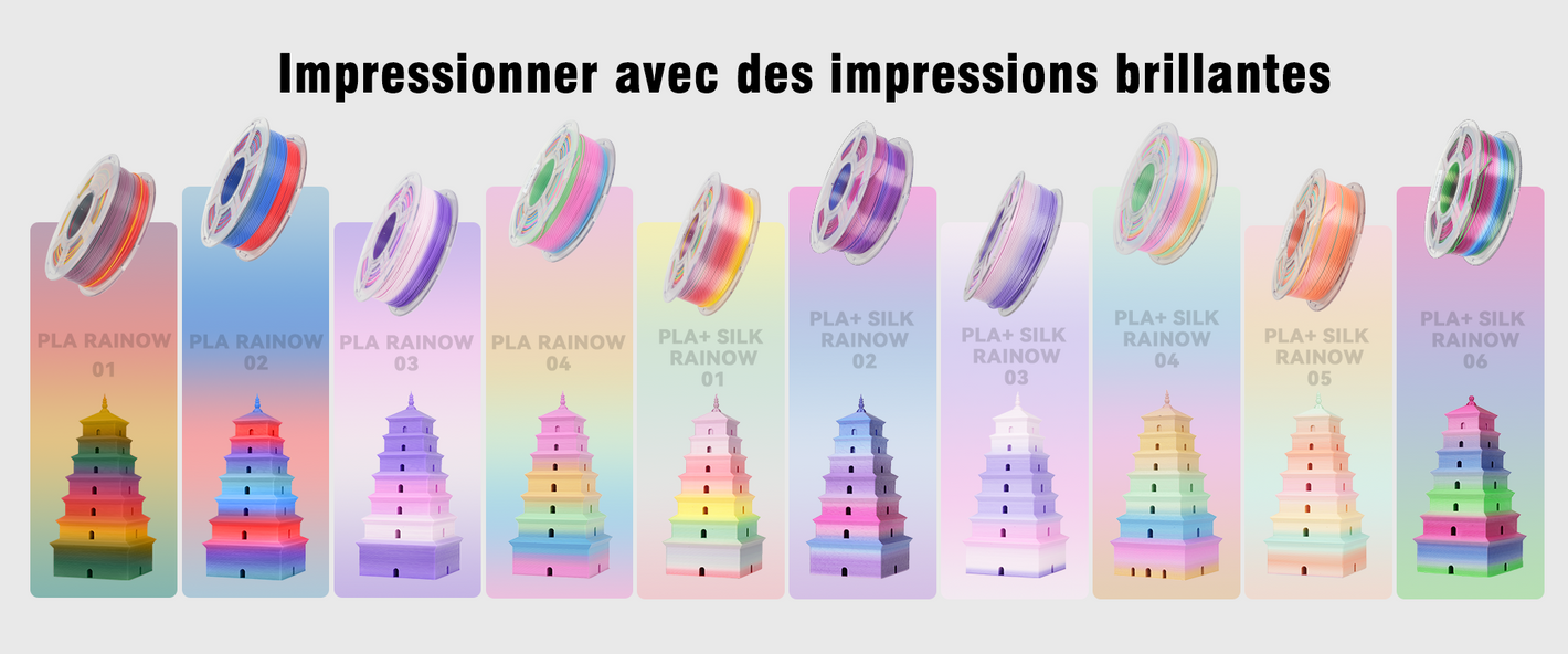 【Rainbow Multicolor】– Fabriqué à partir de PLA/PLA+ soyeux de haute qualité, ce filament crée un remarquable effet multicolore arc-en-ciel. Les transitions progressives rendent vos impressions plus uniques, artistiques et visuellement attrayantes.