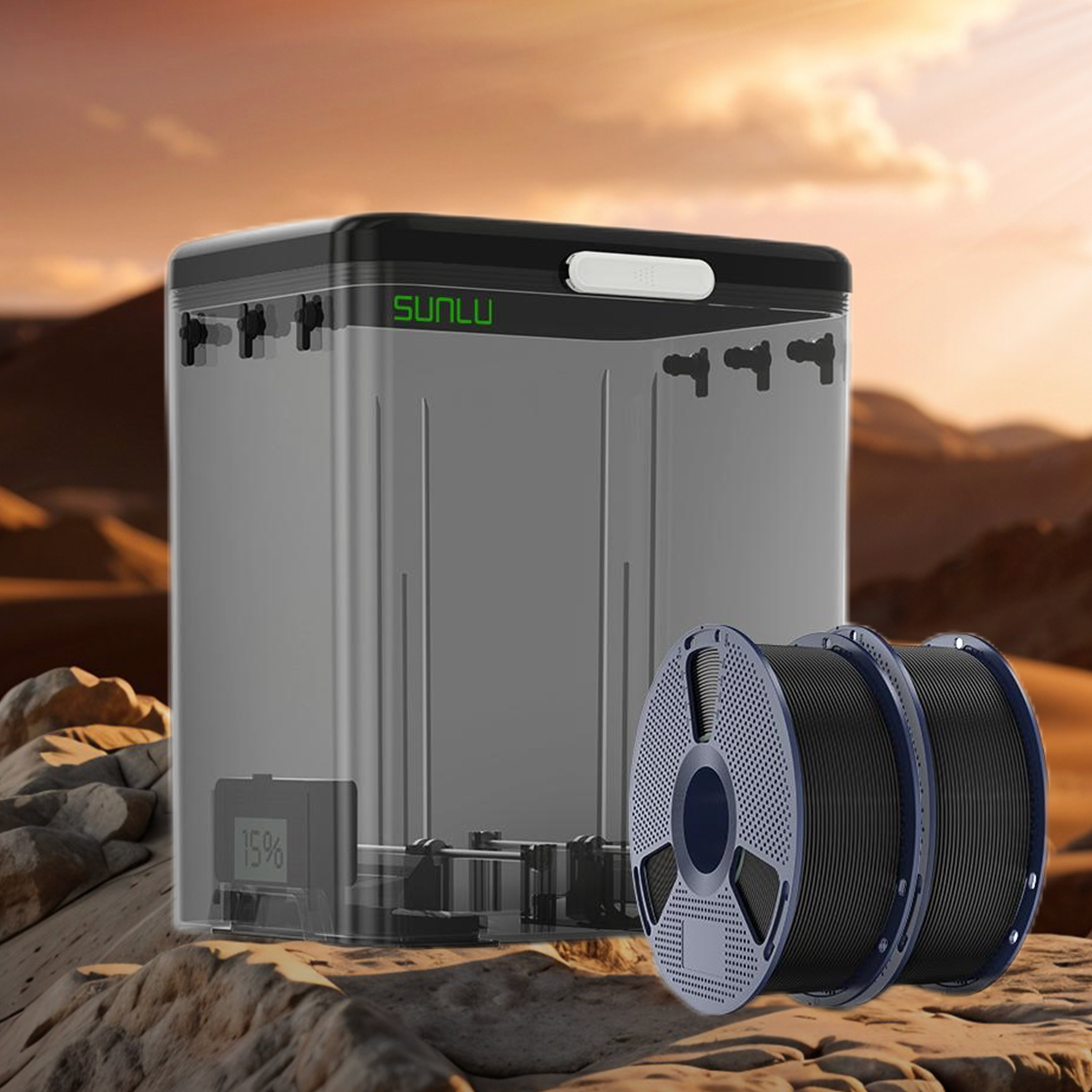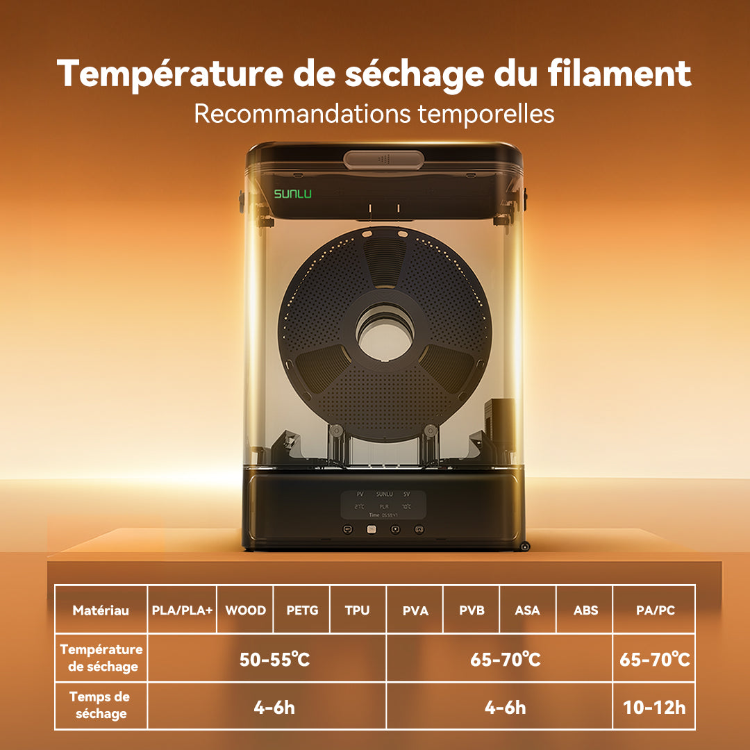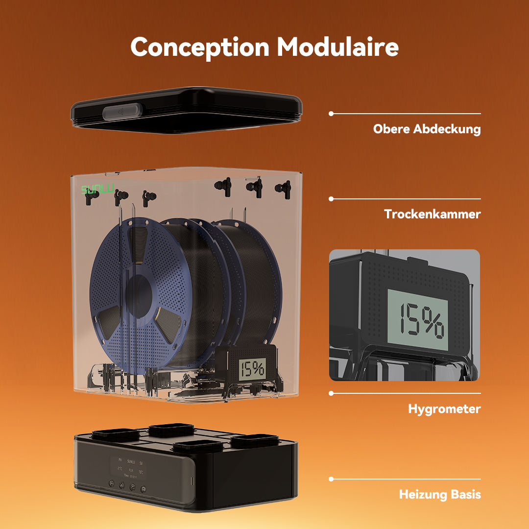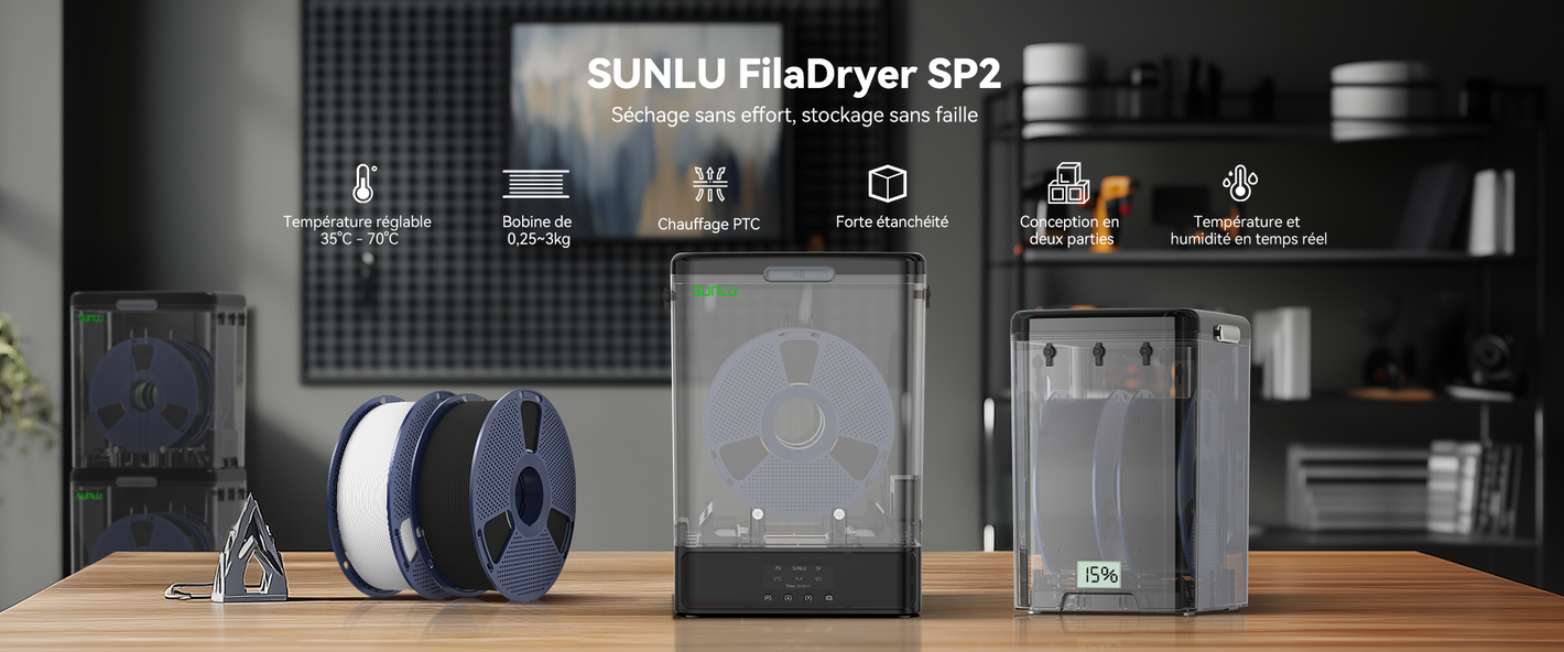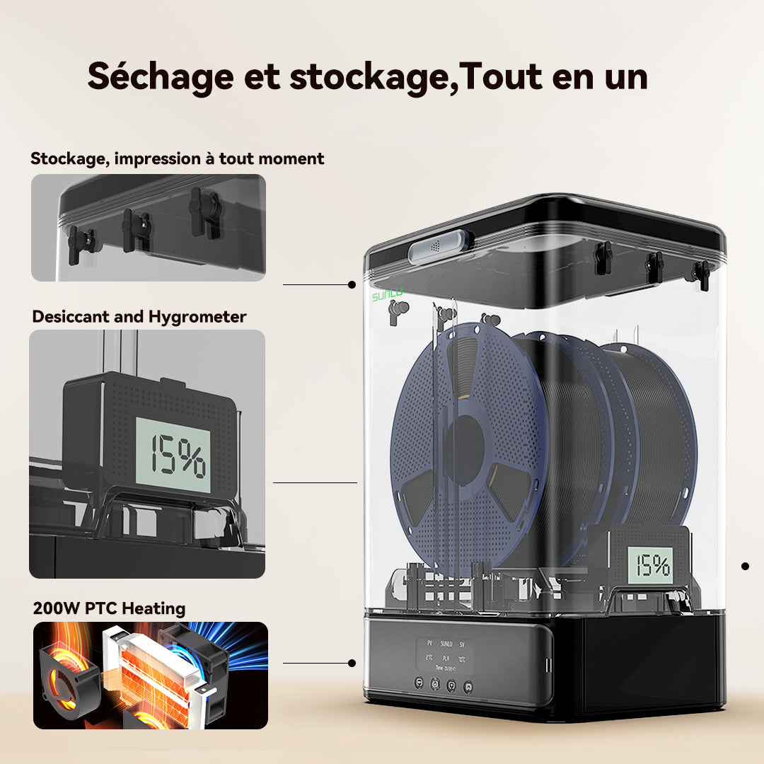 [Sécheur de filaments 2-en-1 et boîte de rangement] Existe-t-il un moyen de sécher et de ranger les filaments en même temps ? SUNLU FilaDryer SP2, avec une base chauffante efficace et une boîte de stockage, est conçu comme deux parties séparées. Plusieurs boîtes de stockage peuvent être utilisées comme boîtes de stockage peuvent être librement empilées (un maximum de 3 est recommandé) pour améliorer l'utilisation de l'espace.
