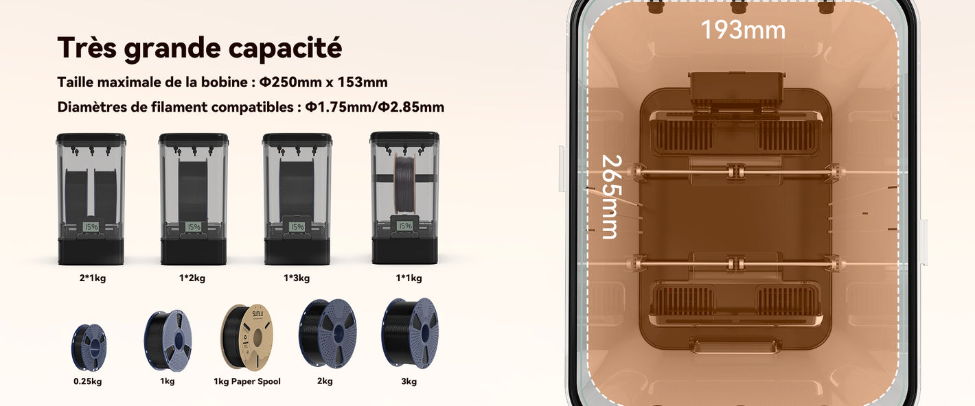[Grand espace intérieur et compatibilité avec les bobines] La compatibilité interne avec les bobines de 0,25~3kg, et même avec les bobines de papier, peut également être réalisée en fixant le rouleau de la bobine. Le compartiment de la boîte de stockage peut contenir deux rouleaux de filaments de 1 kg, un rouleau de 2 kg (2 rouleaux de filaments de 2 kg pour SUNLU) et des filaments de 3 kg. Il supporte un diamètre de bobine maximum de 250 mm et une largeur de bobine maximum de 153 mm. Il est compatible avec les filaments de 1,75 mm et de 2,85 mm de diamètre. Même les bobines endommagées peuvent être réparées à l'aide du rouleau.