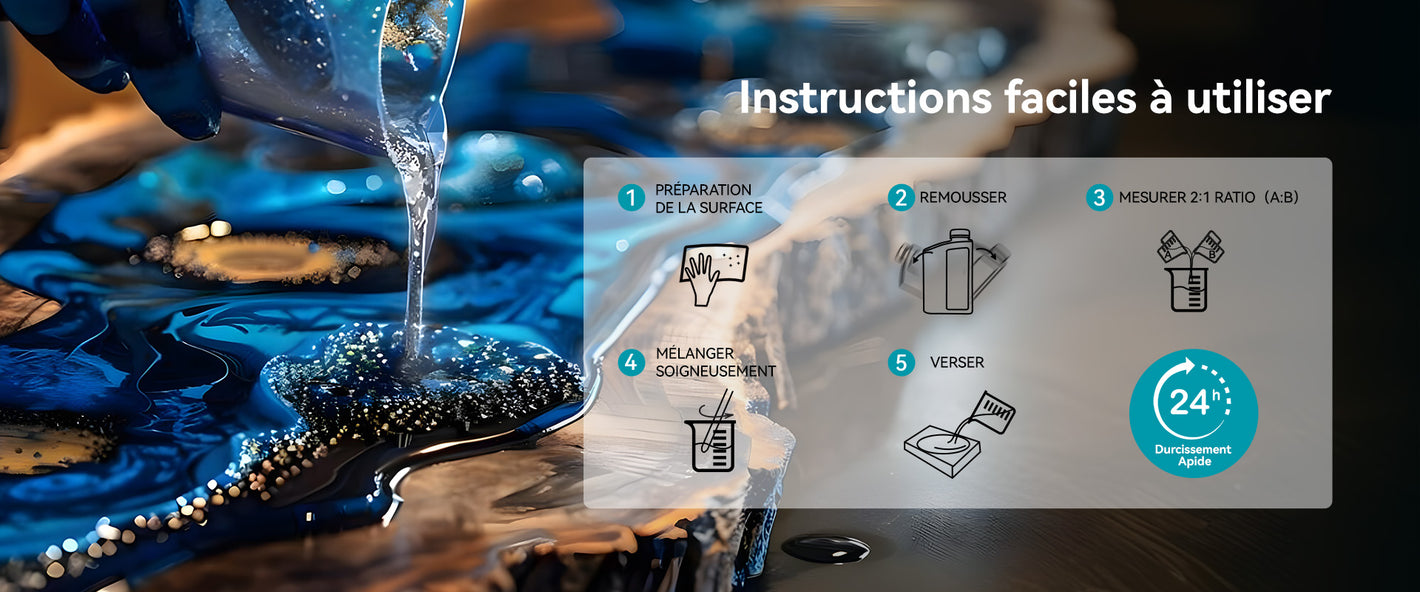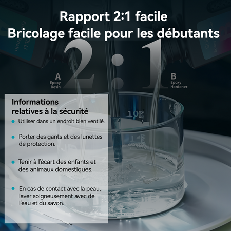 [FACILE À UTILISER AVEC UNE PIÈCE A & B] Agiter la bouteille pour bien mélanger la résine. Mélanger la résine et le durcisseur dans un rapport de 2:1 et remuer pendant 3 à 5 minutes. Le projet est terminé en 40 minutes.