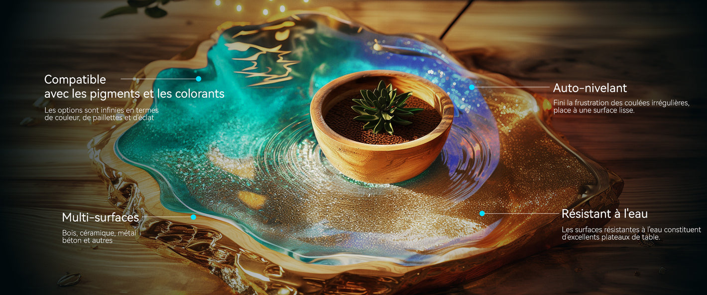 Il est également couramment utilisé pour créer une large gamme d'objets décoratifs. Il peut s'agir de presse-papiers, de sous-verres, d'œuvres d'art murales ou de figurines. La capacité de la résine à être moulée dans pratiquement n'importe quelle forme, combinée à son aspect transparent, semblable à celui du verre, permet de concevoir des pièces décoratives complexes et magnifiques qui peuvent mettre en valeur n'importe quel espace de vie. De plus, l'ajout de pigments, de paillettes ou d'objets incrustés augmente encore les possibilités de personnalisation.