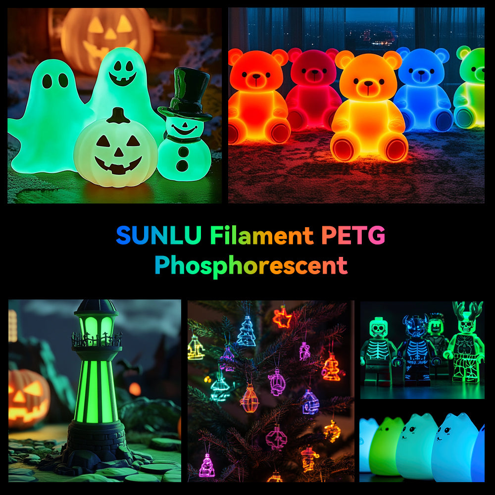 [Parfait pour les décorations de vacances] Le filament SUNLU PETG Glow crée des impressions étonnantes qui brillent dans l'obscurité, parfaites pour décorer les fêtes, les festivals et les célébrations nocturnes.Jouer une variété de propriétés qui brillent dans l'obscurité environnement peut utiliser le PETG glow-in-the-dark. Imprimez des plaques signalétiques, des enseignes, des logos, des bijoux, etc.