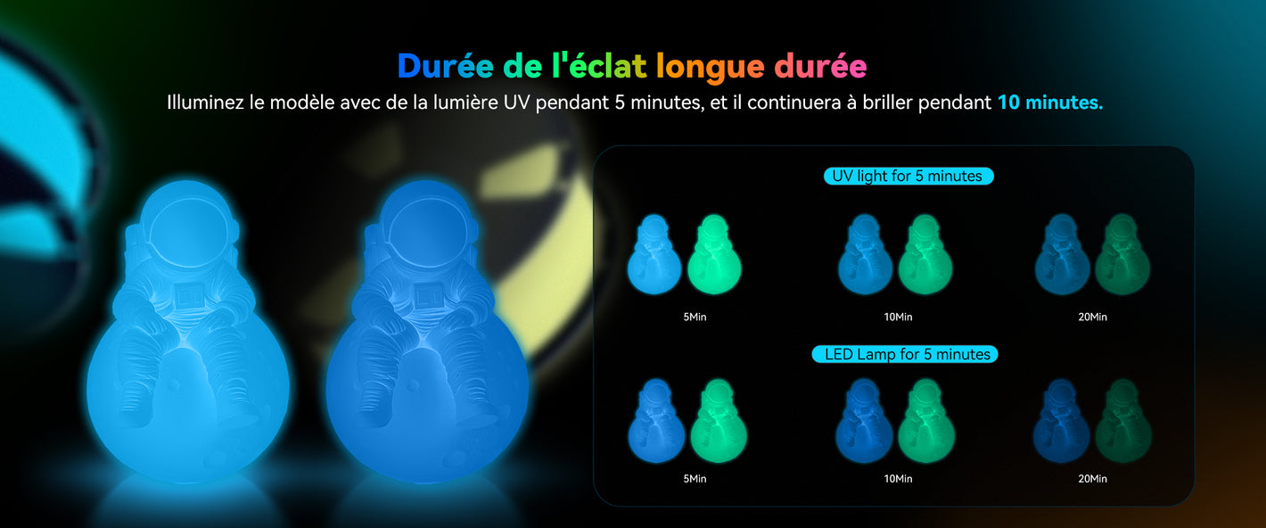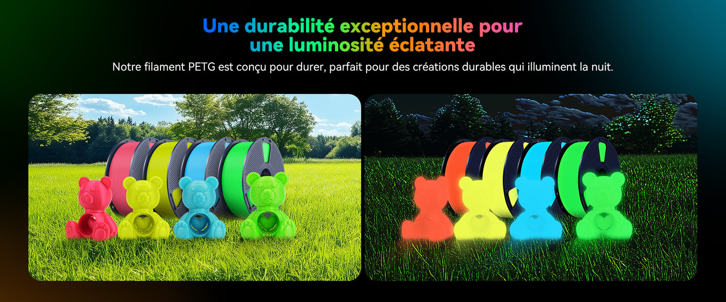 [Excellent effet phosphorescent dans l'obscurité] L'absorption de la lumière peut être un PETG lumineux la nuit (contenant 10 % de poudre lumineuse), l'effet lumineux est proche du PLA lumineux, la nuit ou dans un environnement plus sombre peut être visualisé pendant une durée d'environ 10 minutes.