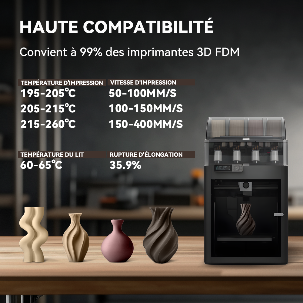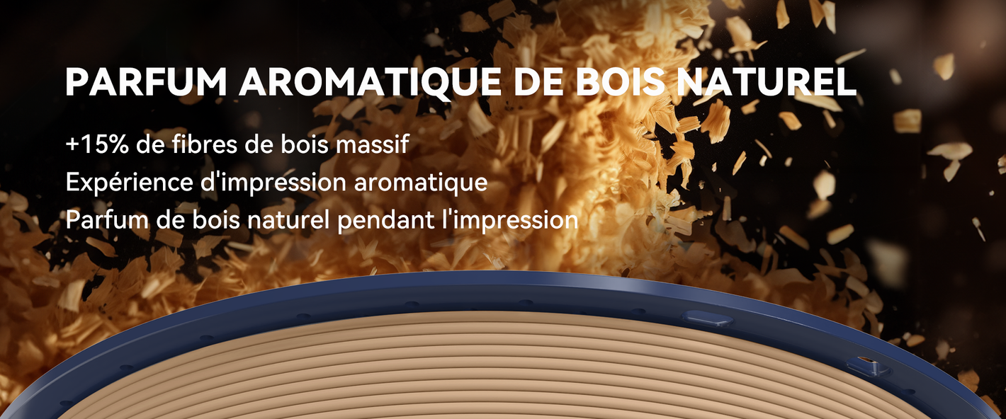 Contient 15 % de poudre de bois, ce qui donne une odeur naturelle de bois pendant l'impression et des résultats qui ressemblent beaucoup à du vrai bois.