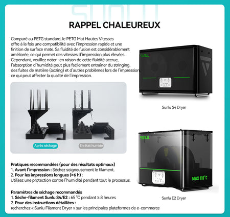 - Sèche-filament Sunlu S4/E2 : 65 °C pendant ≥ 8 heures