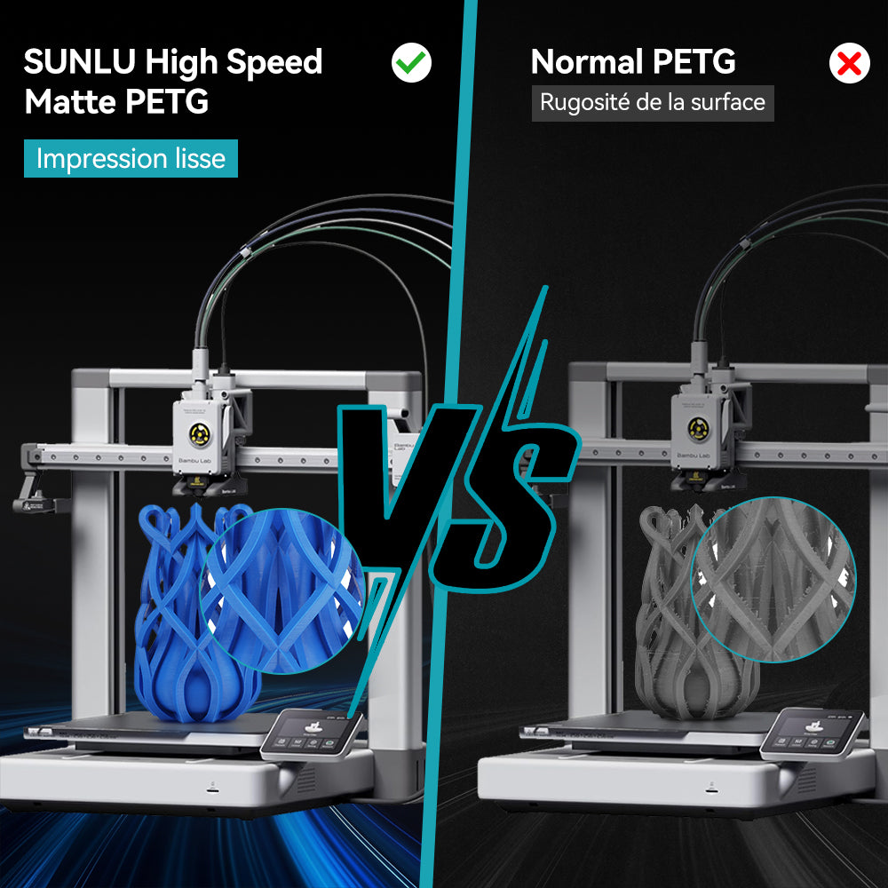 Comparé au PETG standard, le PETG Mat Hautes Vitesses offre à la fois une compatibilité avec l’impression rapide et une finition de surface mate. Sa fluidité de fusion est considérablement améliorée, ce qui permet des vitesses d’impression plus élevées. Cependant, veuillez noter : en raison de cette fluidité accrue, l’absorption d’humidité peut plus facilement entraîner du stringing, des fuites de matière (oozing) et d’autres problèmes lors de l’impression, ce qui peut affecter la qualité de l’impression.