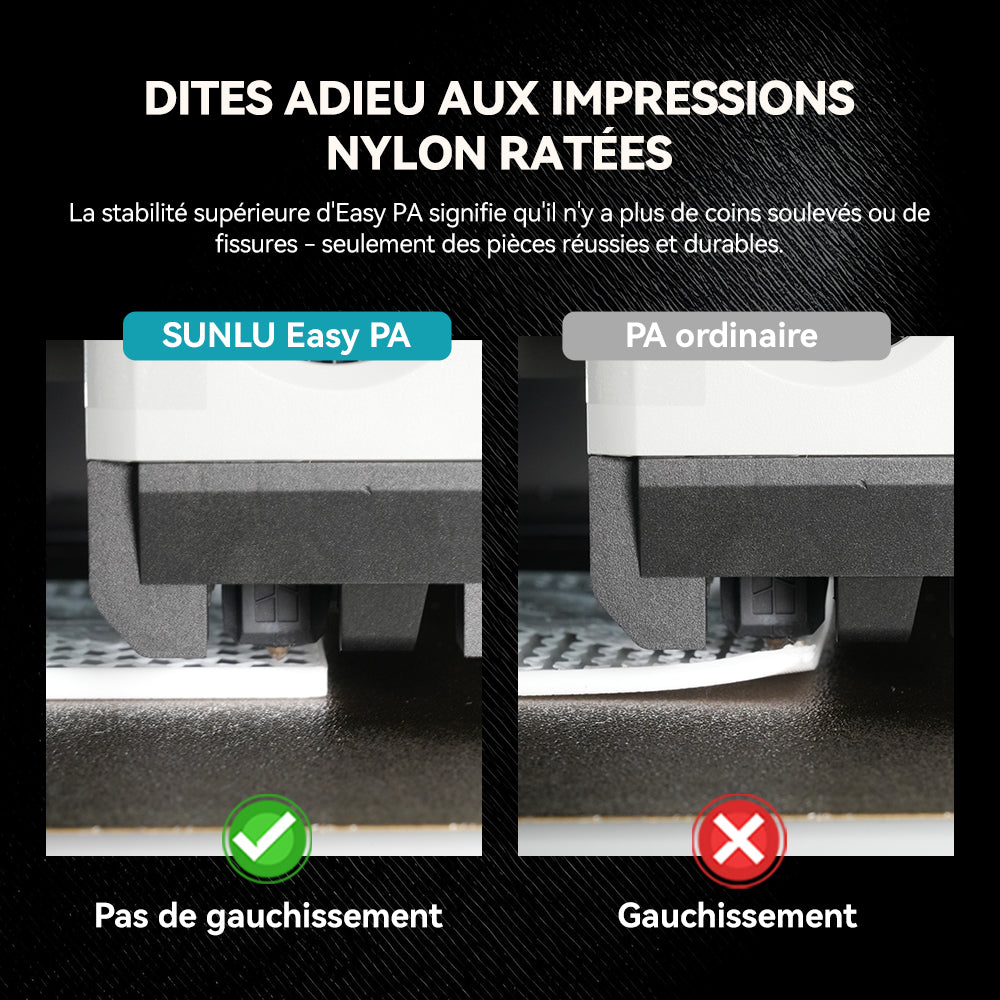 Fatigué des problèmes récurrents liés aux filaments PA standard : craquelures frustrantes, déformations tenaces et sensibilité constante à l'humidité qui ruinent vos impressions et votre filament ? SUNLU Easy PA est la solution technique que vous attendiez !