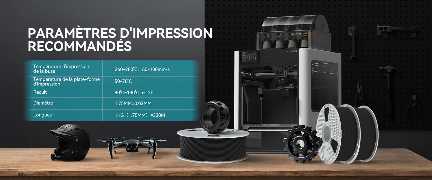 Le PA12-CF absorbe les chocs et résiste aux fissures, même en cas de chute ou de collision soudaine. Faites-lui confiance pour les équipements d'extérieur robustes, les composants de drones ou les pièces structurelles qui doivent survivre à des conditions difficiles sans compromettre leur intégrité.