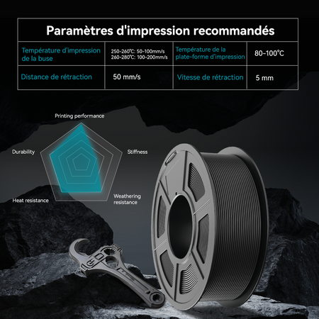 [Réglage d'impression recommandé] Température d'impression de la buse : 250-260℃, Température de la plateforme d'impression : 80-100℃, Vitesse d'impression : 40-60mm/s, Distance de rétraction : 5mm, Vitesse de rétraction : 50mm/s. Compatible avec la plupart des imprimantes 3D FDM qui peuvent utiliser un filament d'imprimante 3D de 1,75 mm.