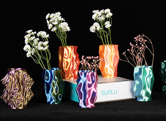 SUNLU Multi Color Silk PLA Plus 3D Printer Filament, offre une expérience d'impression multicolore avec un seul filament. Des créations imprimées avec des couleurs variées sous différents angles.