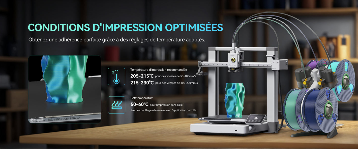 [Paramètres recommandés] Pour de meilleurs résultats, utilisez une température de buse de 205 °C à 215 °C (401 °F à 419 °F) et une température de lit de 50 °C à 65 °C (122 °F à 149 °F).