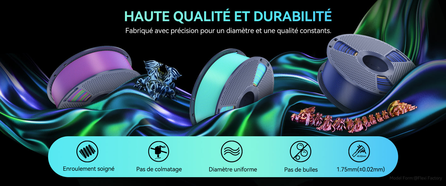 Le filament 3D Silk offre une texture soyeuse et lisse avec des couleurs vibrantes et accrocheuses. Sa surface éblouissante ne nécessite aucun polissage, ce qui confère à chaque création un éclat artistique.