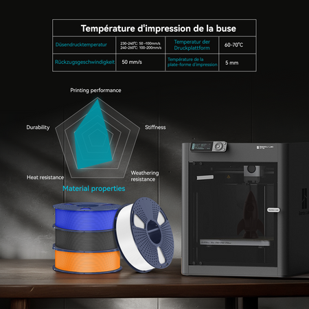 Nous recommandons d'imprimer le filament PETG à une température de buse de 220-230°C, une température de lit de 60-70°C et une vitesse d'impression de 40-600mm/s.