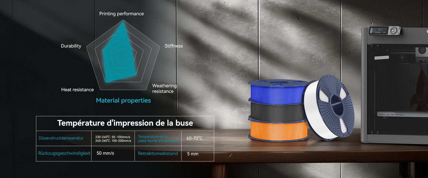 [Résistance élevée aux chocs] Grâce à sa résistance élevée aux chocs, le PETG est parfait pour l'impression de pièces qui doivent résister aux chocs et aux chutes, garantissant ainsi des performances durables sans fissures ni cassures.