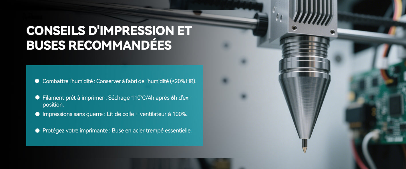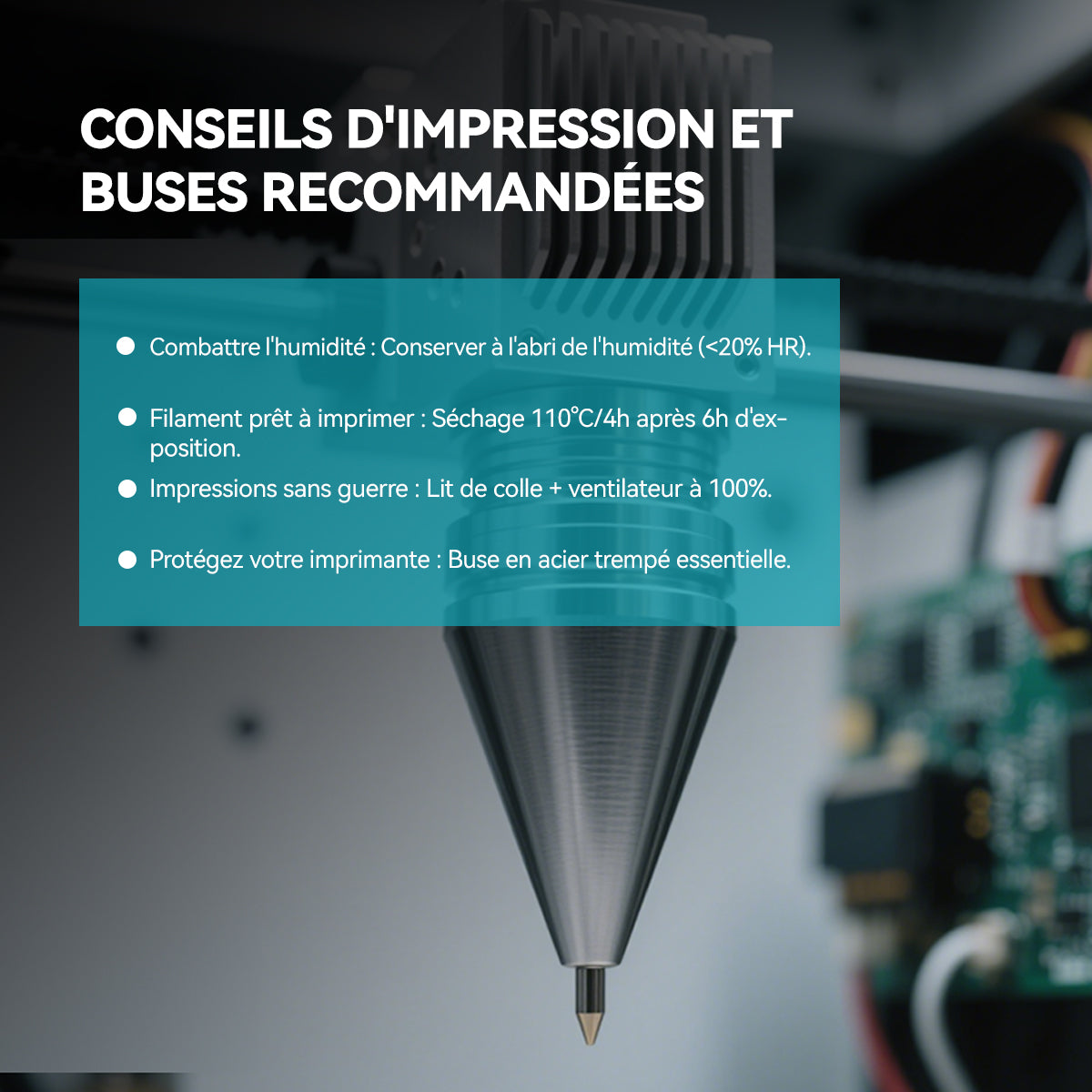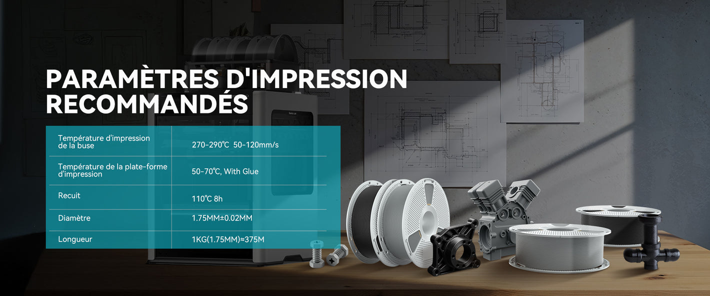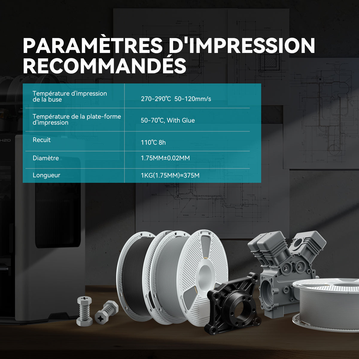 [Redéfinir les applications de performance] Ce filament robuste et ultra-durable de 1,75 mm offre une résistance exceptionnelle. Idéal pour les composants de sièges aérospatiaux, les supports automobiles soumis à de fortes contraintes (phares), les supports de moteur de drones et les raccords agricoles lourds.