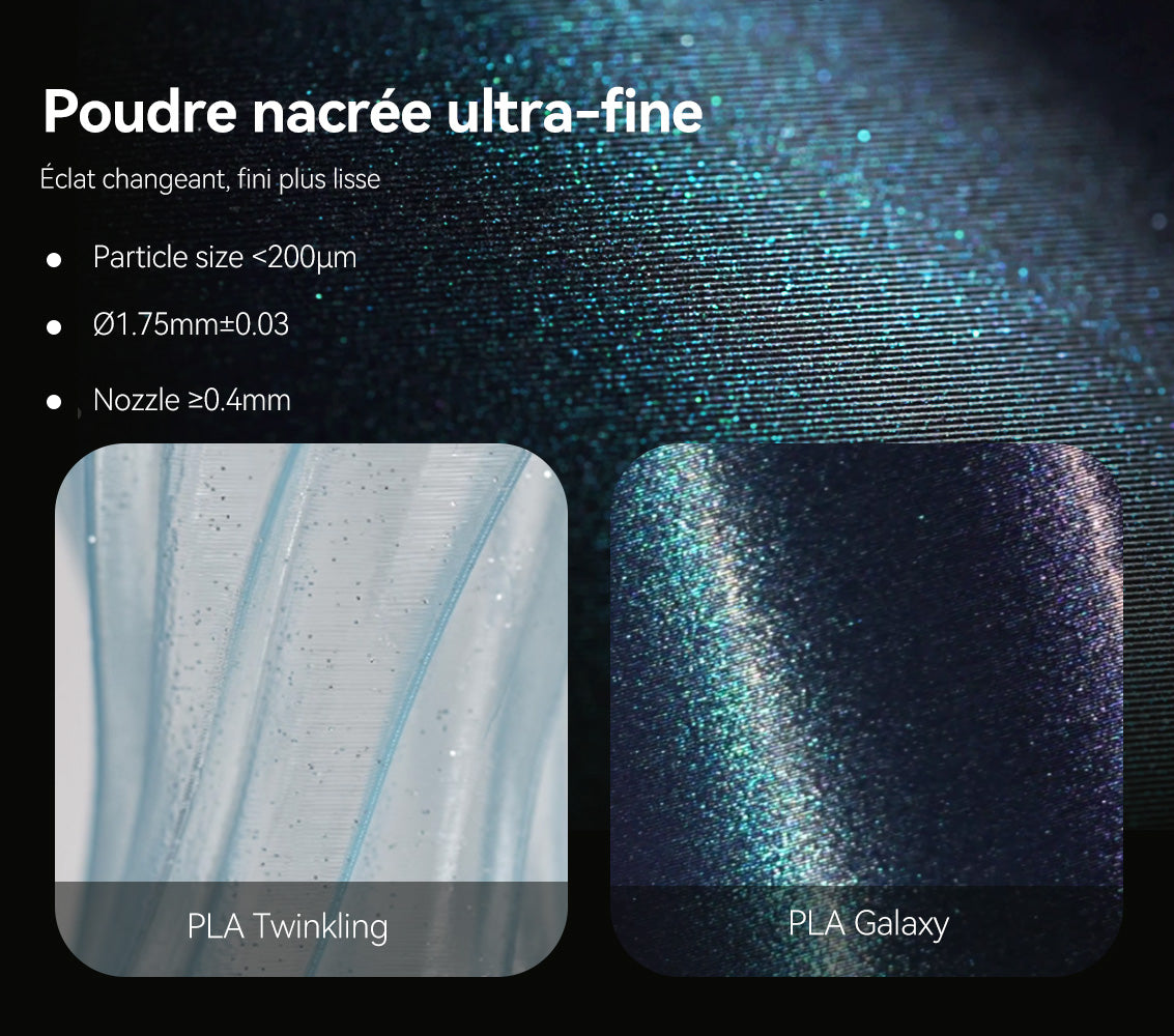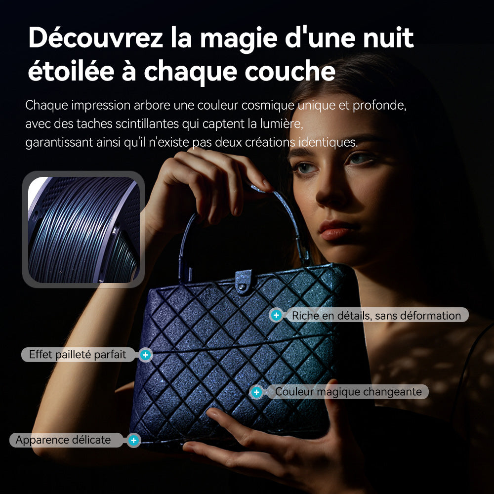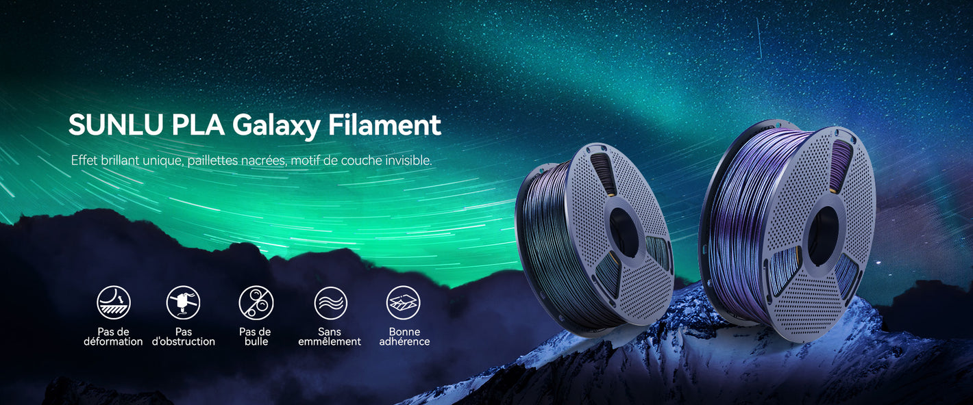 S’inspirant de la beauté de la Voie lactée, le filament SUNLU PLA Galaxy combine un fond cosmique profond avec des effets d’éclats scintillants. Grâce à sa poudre nacrée ultrafine changeant de couleur (taille des particules <200µm), vos impressions 3D révéleront des variations de couleur dynamiques selon l’angle de la lumière. Le résultat est une finition étoilée éblouissante qui rend chaque création extraordinaire et véritablement unique.