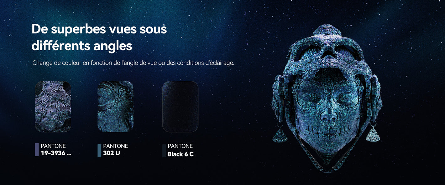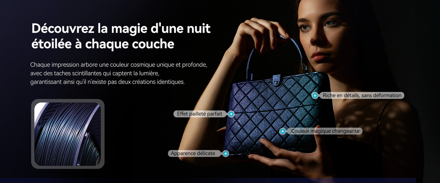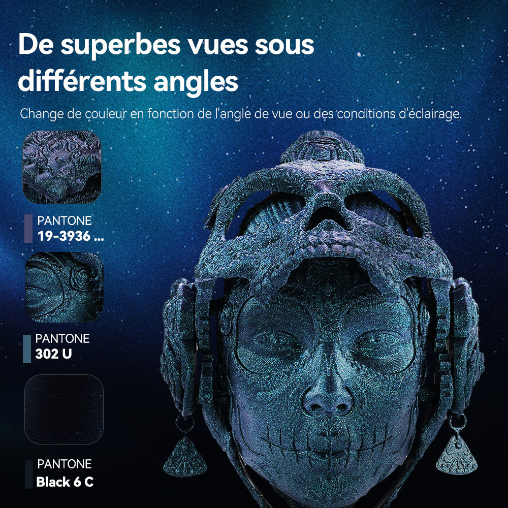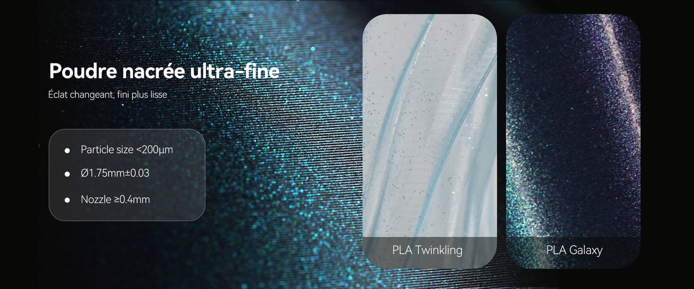 S’inspirant de la beauté de la Voie lactée, le filament SUNLU PLA Galaxy combine un fond cosmique profond avec des effets d’éclats scintillants. Grâce à sa poudre nacrée ultrafine changeant de couleur (taille des particules <200µm), vos impressions 3D révéleront des variations de couleur dynamiques selon l’angle de la lumière. Le résultat est une finition étoilée éblouissante qui rend chaque création extraordinaire et véritablement unique.