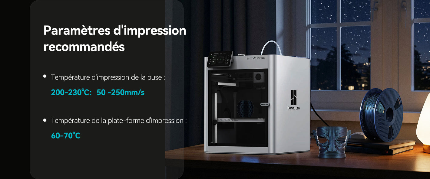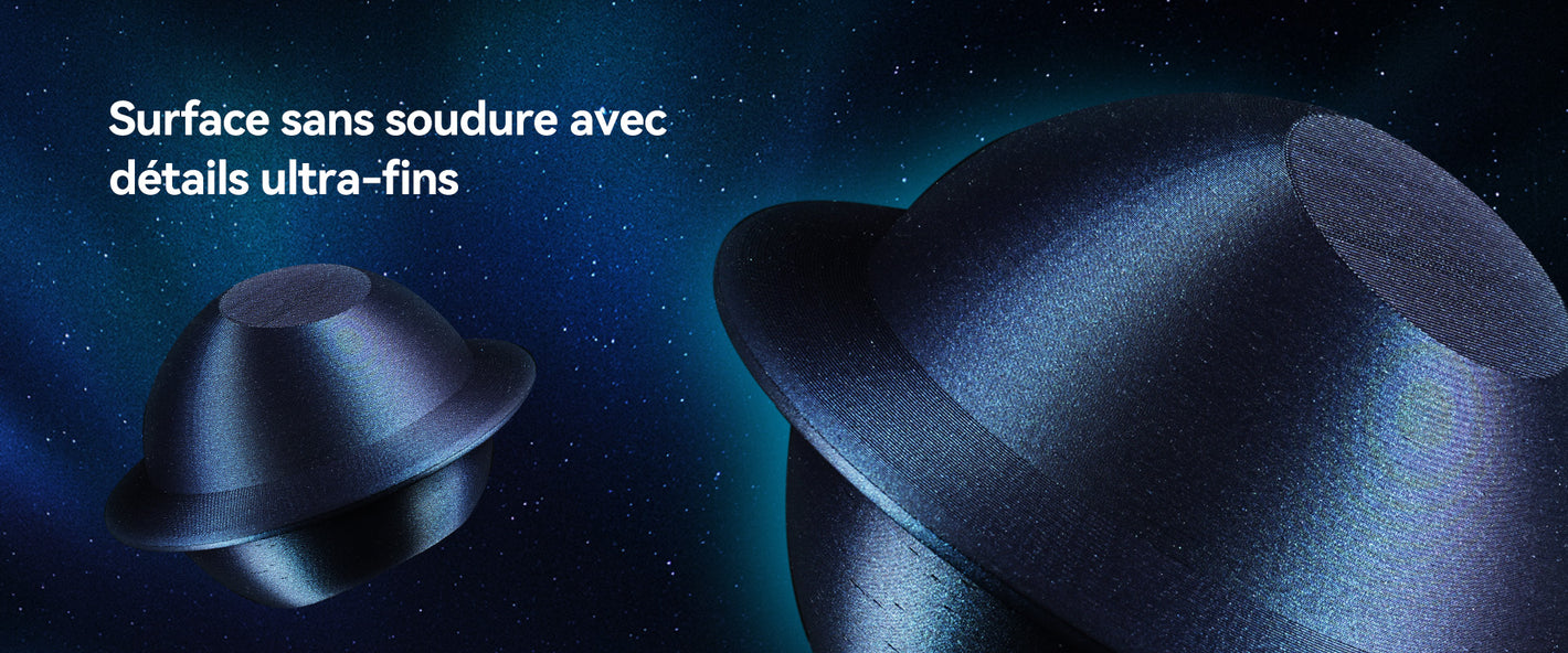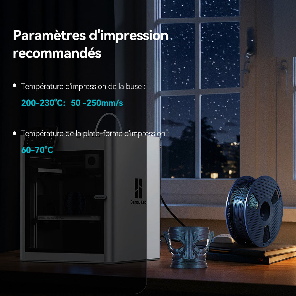 Au-delà de son apparence spectaculaire, le PLA Galaxy est également conçu pour la performance. Avec une résistance à la traction de 100 MPa et une résistance à la flexion de 163 MPa, il produit des impressions à la fois belles et robustes. Sa capacité de déflexion thermique jusqu’à 176 ℃ ajoute de la stabilité, tandis que sa qualité 100 % sans bulles garantit des résultats constants rouleau après rouleau.