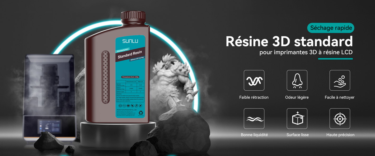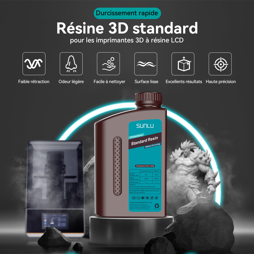 [Résine facile à nettoyer et moins odorante] La résine standard SUNLU offre un nettoyage sans effort avec de l'alcool isopropylique ou de l'éthanol, ce qui donne une finition de surface lisse. L'odeur pendant l'impression 3D est légère.